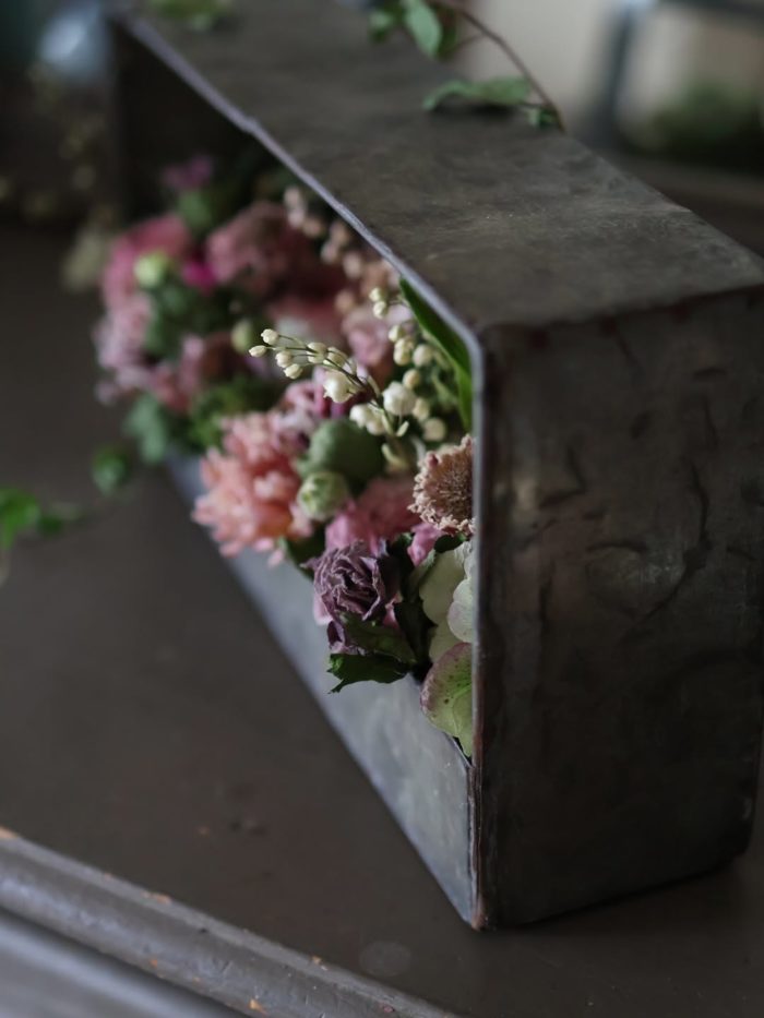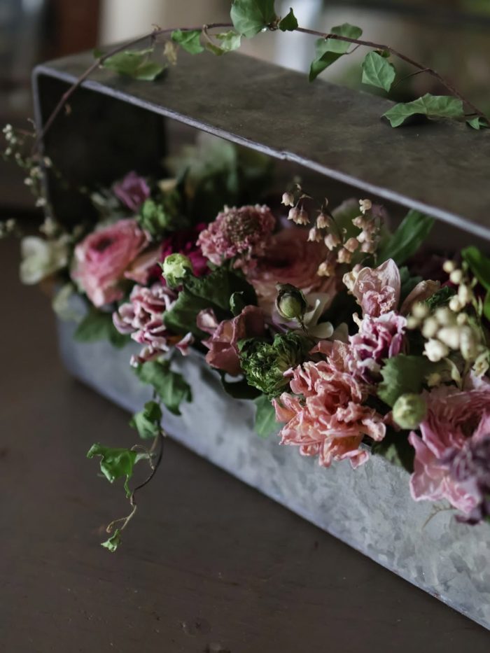 横長のブリキのボックスに、チューリップやラナンキュラス、クリスマスローズなどの春のお花をアレンジします。