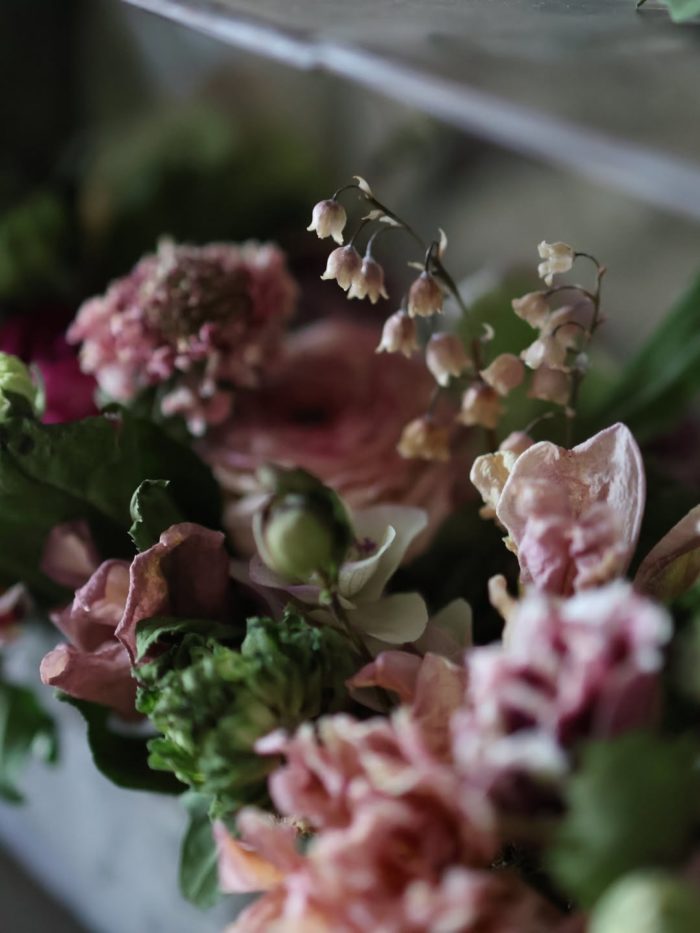 ポイントにアベイユフルール(蜜蝋花)のピンクスズランや白いスズランを添えて。